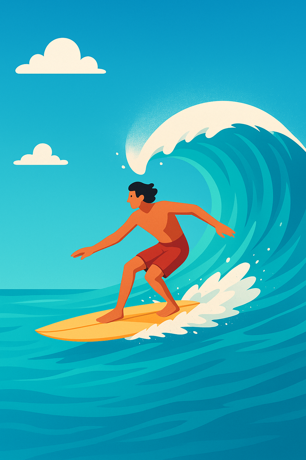 Prompt 10: Give me an illustration of a person surfing on a wave in the ocean. The scene should show a sunny sky, blue water, and the surfer riding a wave with balance and energy.